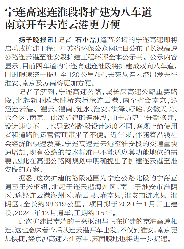 【扬子晚报】宁连高速连淮段将扩建为八车道 南京开车去连云港更方便