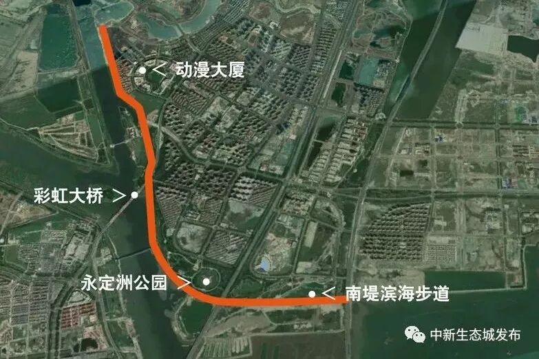 打通这一关键路段后,生态城居民将可以沿着动漫南路的河堤慢行步道,一直行至彩虹大桥——永定洲公园——南堤滨海步道,打卡“沿河步道之旅”。