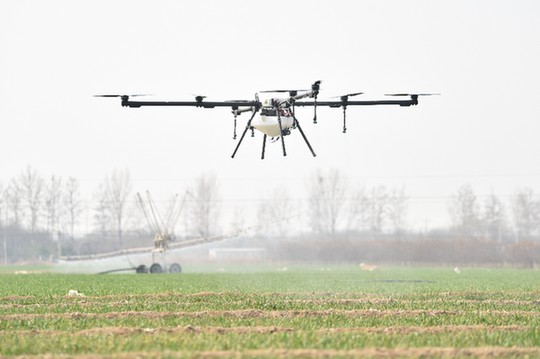 3月19日,一台植保无人机在定州市小洼里村麦田进行喷药作业。