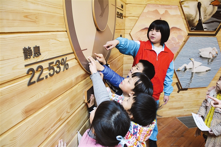 在天鹅小镇,好运角中学的学生志愿者为前来参观的市第一实验幼儿园的弟弟妹妹讲解大天鹅的习性和环保知识。