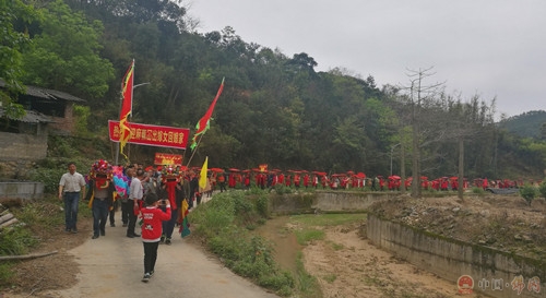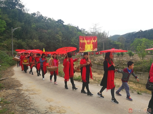 “咚咚咚……”石角镇黄花麻蕉冚村锣鼓喧天,非常热闹!3月17日上午,村中的父老乡亲敲着乐鼓、醒着狮子队、放着鞭炮,一齐来到村口迎接出嫁女的回归。130多位出嫁女身披红围巾、手撑红油伞、肩担提篮、抬着烧猪,排着整齐的队伍,向着祠堂出发。来到祠堂,逐一上香,供奉祖先。