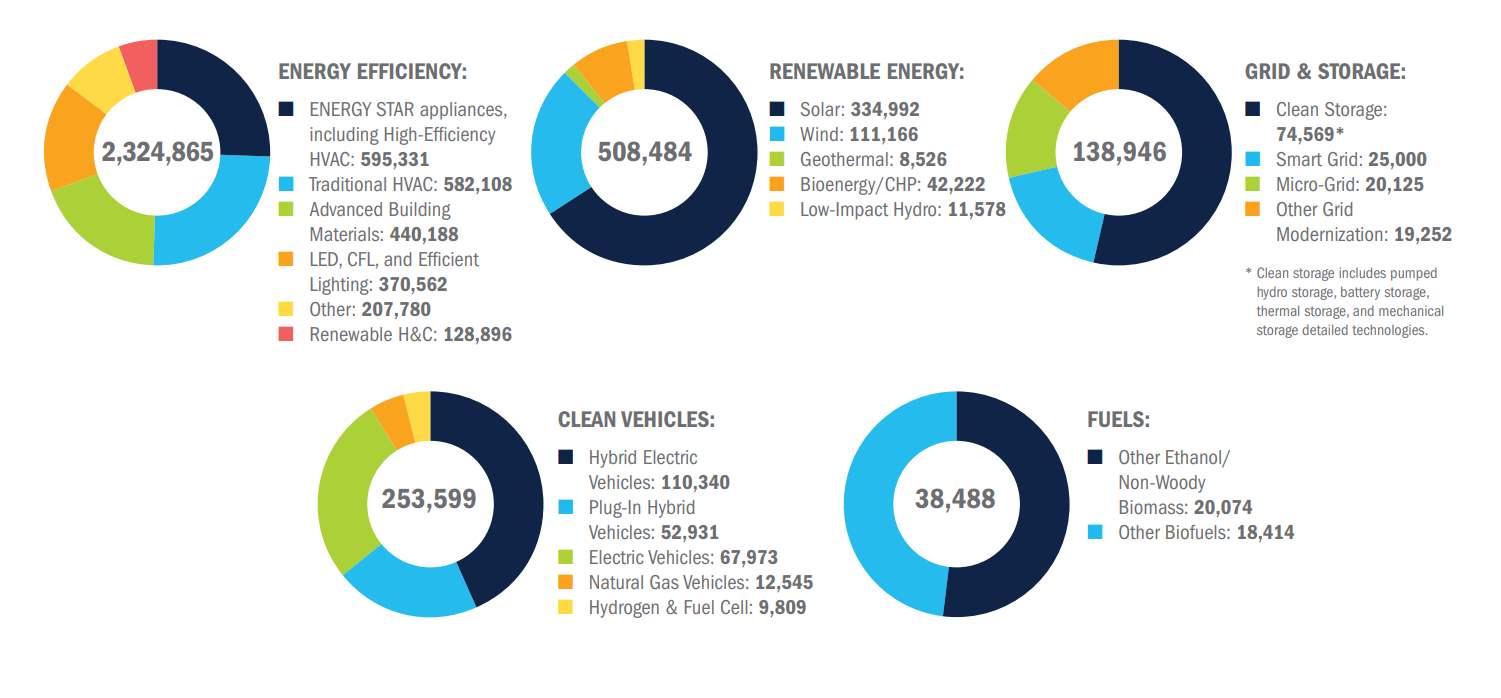 2018年,储能行业就业人数增加14%,新能源汽车行业就业人数增加15%。这些行业受到国家充电基础设施的扩张、电池价格下降以及太阳能+储能采用率提高的支撑。截止2018年底,清洁能源储能行业的就业人数达到75,000人,有史以来最高水平,而新能源汽车的就业人数为254,000人。