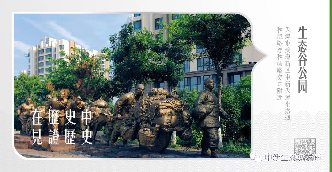 全长12公里的生态谷贯穿生态城南北,是一个集绿色出行、绿化景观为一体的开放式公园绿道。为增加公园的文化气息,生态谷内还专门设置了雕塑文化教育区,26组雕像、800多个人物,展示了天津600多年来的重要事件、人物和民风民俗。