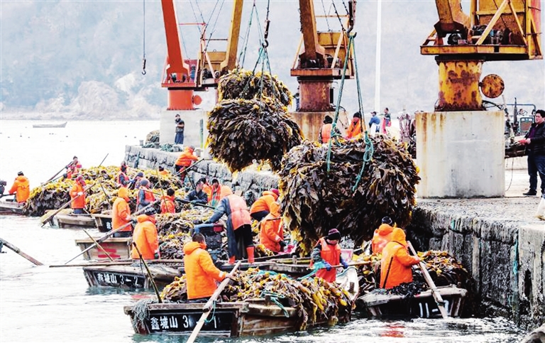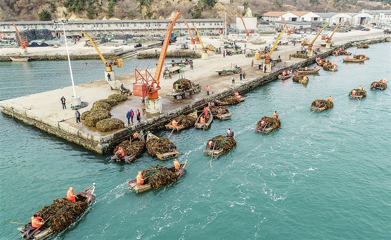 3月20日,成山镇成山码头一片繁忙景象,渔民驾驶装满海带的舢板,从养殖区归来,依次停靠码头。这是我市今年首批收割的海带。