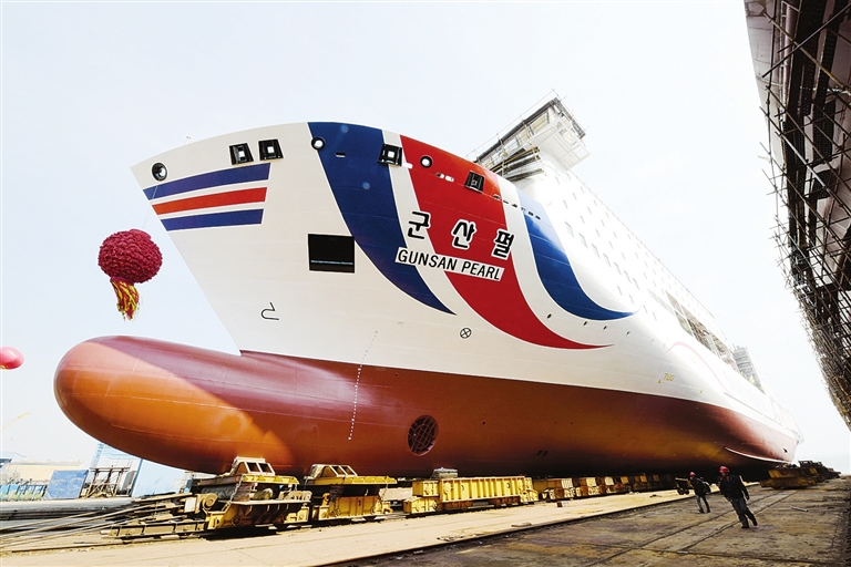 3月14日,黄海造船有限公司为石岛集团建造的豪华客滚船“群山明珠”顺利下水。