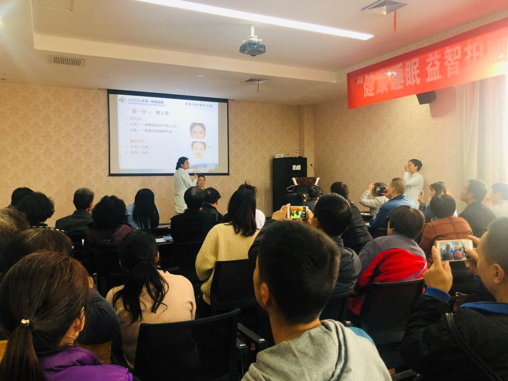 3月21日上午在交大一附院门诊一楼大厅,精神心理卫生科陈云春主任带领5名专家,为门诊200多名睡眠障碍患者进行了义诊及答疑解惑。通过发放宣传册及讲解,为市民普及了睡眠障碍相关知识。现场医务人员耐心、热情地就睡眠问题为大家做了详细的解答与专业的诊疗。义诊活动之后,在东一楼八层第三会议室,进行睡眠知识专题讲座暨春季病友会。陈云春主任为大家做了题目为“关注睡眠,享受美好生活”的主题报告,吸引了将近100多人前来聆听学习。主题报告结束,专科护士刘薇护理师为现场所有的人员讲解、演示了“睡眠保健操”,并带领大家从第一节“开天门”到最后一节“收工”,体验了“睡眠保健操”。大家的参与热情很高,通过中医经络按摩,呼吸、头颈、肩部放松等环节,可以帮助失眠者缓解紧张,促进睡眠。