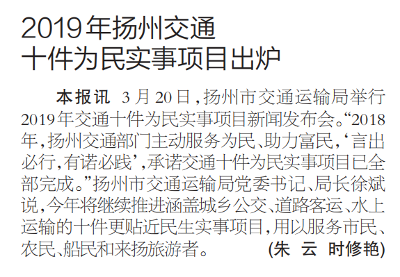 【江苏经济报】2019年扬州交通十件为民实事项目出炉