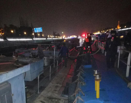 海事人员立即驾艇疏导现场过往船舶航行秩序,通知过往船舶注意避让,并要求浒浦船闸协同做好救援工作。当时长江江面东北风力达6-7级,同时正值江水退潮,水位在不断降低,导致船舶的倾斜度越来越大,已无法用海巡艇拖离搁浅区域,遇险危险品船随时可能发生侧翻。海事工作人员重新对现场情况进行分析研究,决定立即联系附近一艘油船进行过驳作业救援。