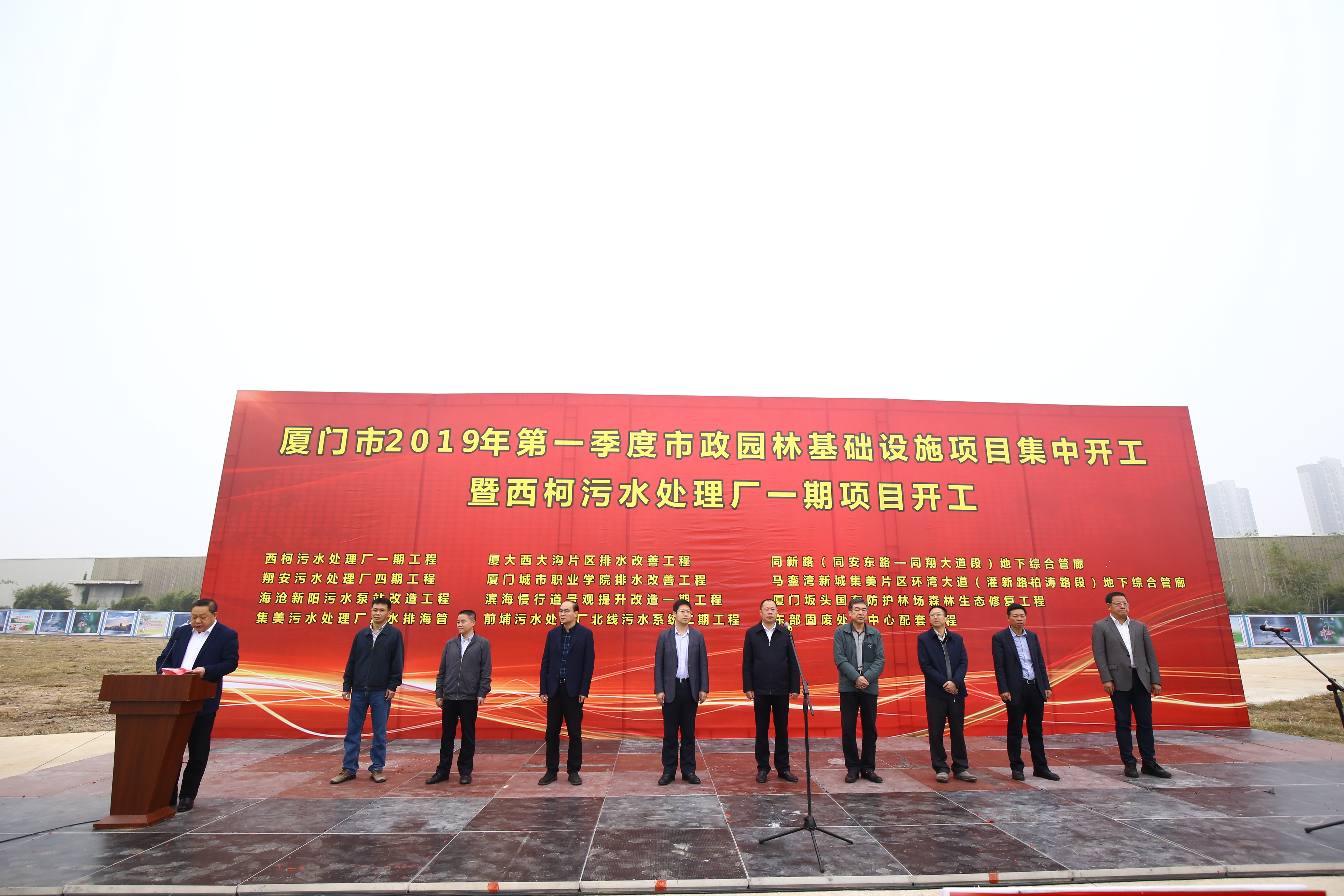 2月20日上午9:00,2019年第一季度市政园林基础设施项目集中开工活动在西柯污水处理厂一期工程项目现场举行,张毅恭副市长出席活动并宣布开工,市政集团陈飞铭董事长、王良睦总经理、陈智强副总经理参加开工活动,活动现场王总代表集团发表讲话。本次集中开工的12个项目中,西柯污水处理厂一期工程、集美污水处理厂尾水排海管工程、前埔污水处理厂北线污水系统二期工程、新阳污水泵站改造工程、翔安污水处理厂四期工程等5个项目由水务集团负责实施建设。既以上项目开工建设后,在建雨水排放口截流项目也将于年内陆续完成,其余项目均处于加紧建设状态,年度计划完成污水项目投资约10亿元,新增污水处理能力9万吨。