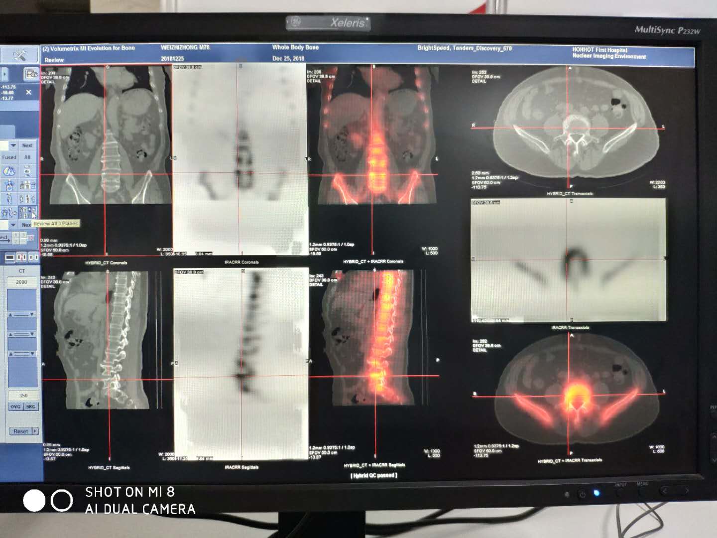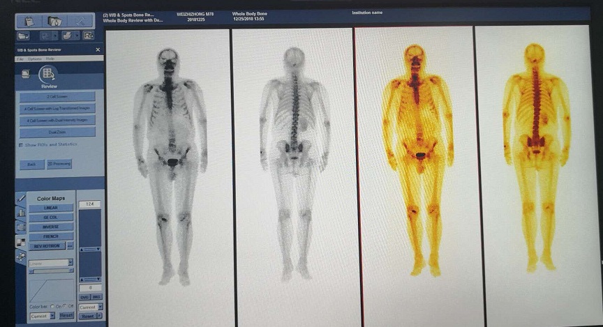 患者男性,78岁,先后被确诊为直肠癌、肺癌及肾脏癌,做过三次手术并连续化疗5年,此次做骨扫描的目的是检查是否有骨转移。扫描过程非常顺利,这给医学影像核医学科的正式运行奠定了基础。