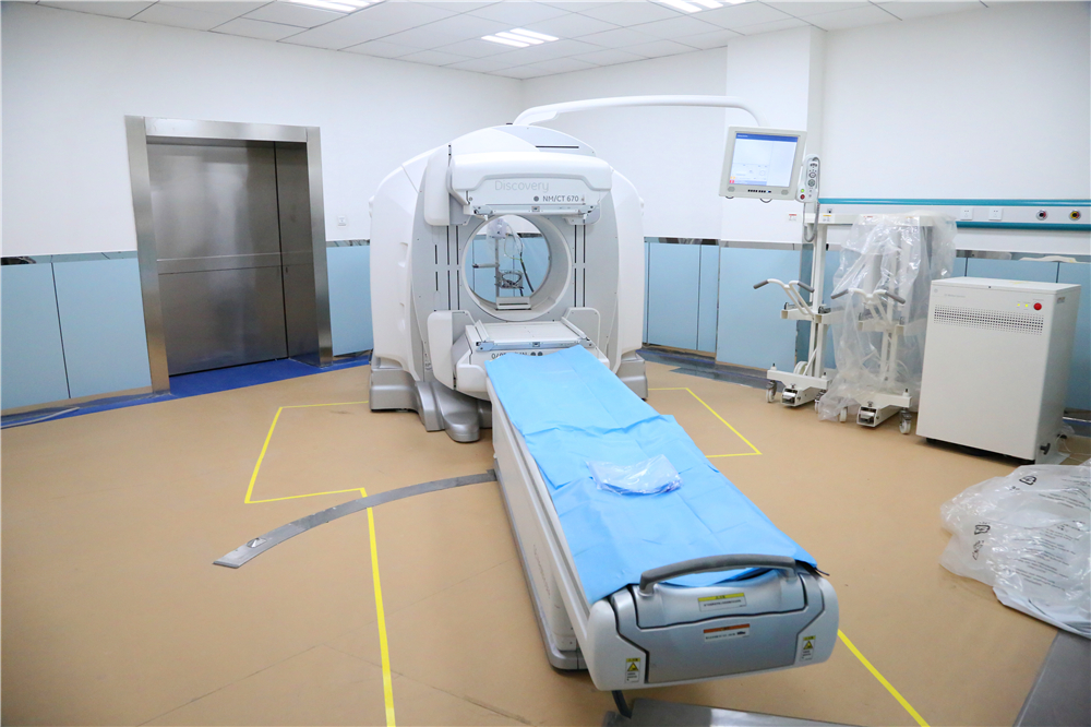 核医学科在门诊大楼负一层,现有两名医生,两名技师,两名护士,预设4张床位,所有人员都曾在内蒙医院核医学科进修学习。新购买GE公司的SPECT/CT一台,型号为Discovery670,是目前核医学领域先进的影像设备之一,不仅能显示脏器和病变的位置、形态、大小等解剖结构,还可以提供有关脏器的血流、代谢及功能等方面的定量、定性信息,是一种分子功能影像,具有灵敏度高等优点,有助于疾病的早期诊断。CT具有良好的解剖分辨率,特异性高。SPECT/CT融合显像将SPECT的高敏感性和CT的解剖特异性有机结合起来,能有效提高病灶的鉴别能力和病灶定位能力,显著减少了不能明确诊断的病灶数目以及重叠部位的病灶定位准确性,尤其是适合解剖结构较复杂的部位,结合薄层CT图像,并可对图像进行三维重建,能显著提高诊断的准确率。