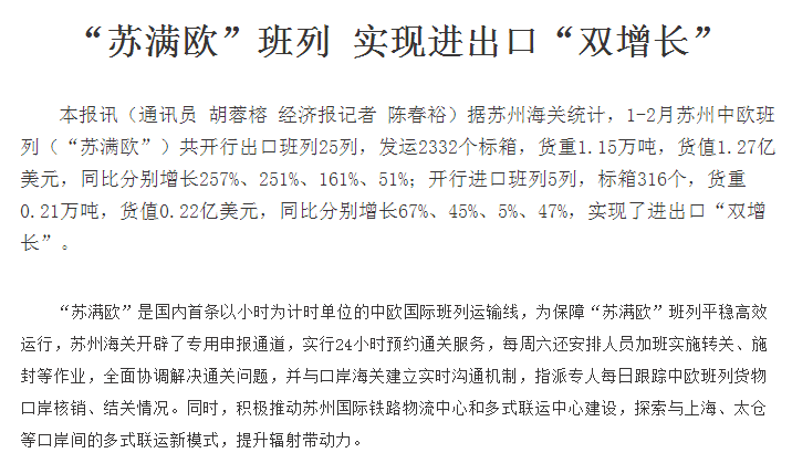 【江苏经济报】“苏满欧”班列 实现进出口“双增长”