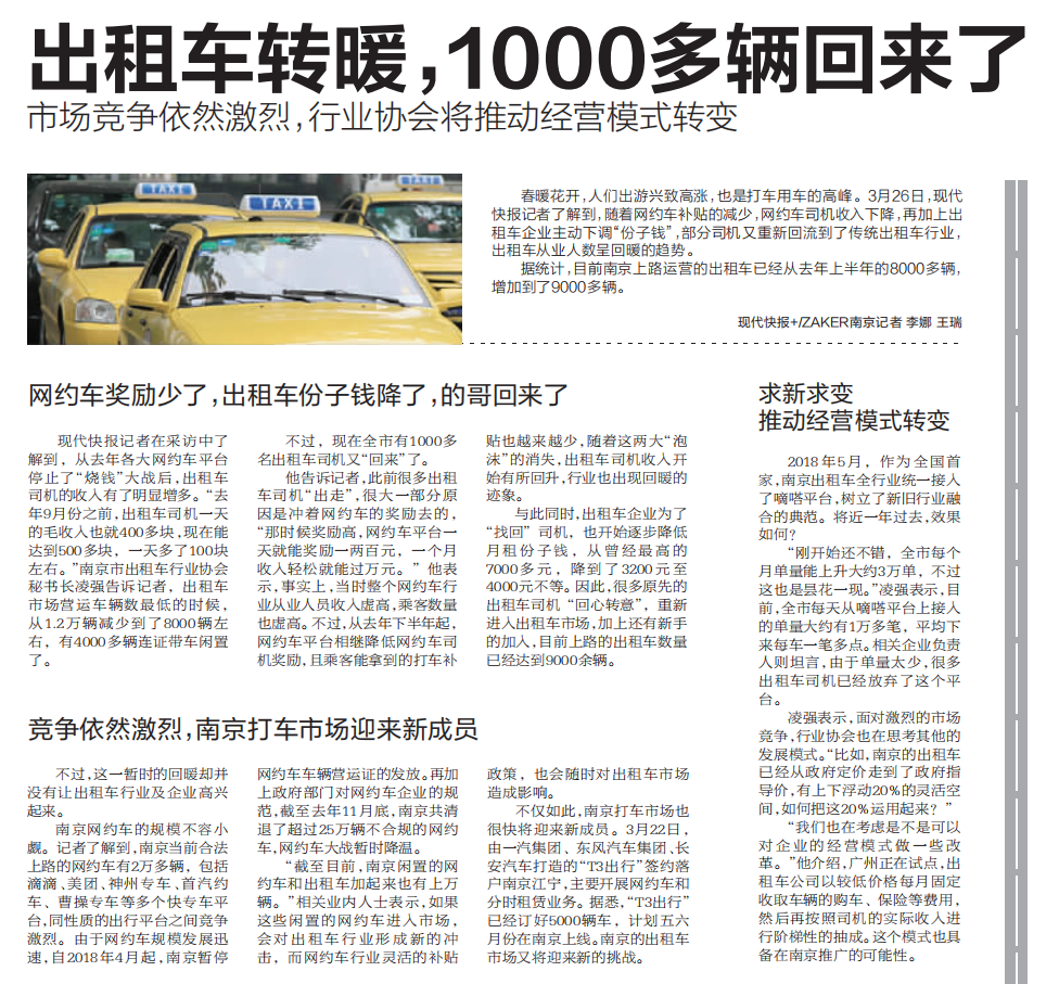 【现代快报】出租车转暖,1000多辆回来了