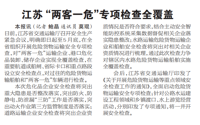 【江苏工人报】江苏 “两客一危”专项检查全覆盖