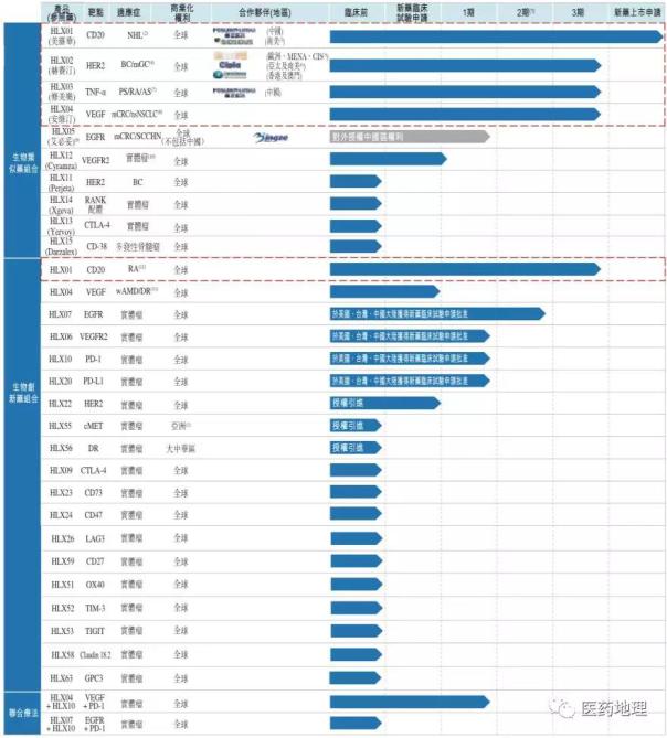 根据复宏汉霖的上市申请显示,复宏汉霖的研发管线包含20种以上自主开发候选生物药及多种肿瘤免疫联合疗法,其中HLX01(利妥昔单抗)已获得NMPA批准上市,HLX02(曲妥珠单抗)、HLX03(阿达木单抗)、HLX04(贝伐珠单抗)正在进行III期临床试验。