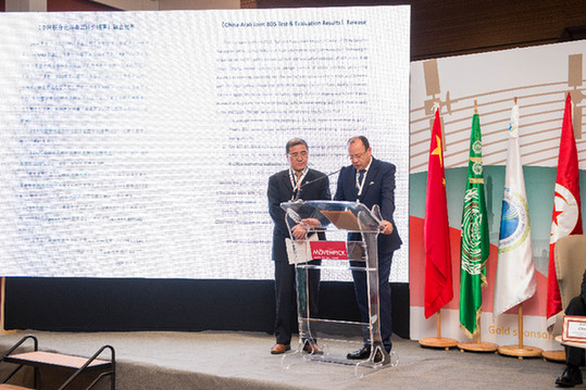 4月1日,在突尼斯首都突尼斯市,阿拉伯信息通信技术组织秘书长穆罕默德·本·阿莫(右)在第二届中阿北斗合作论坛上联合发布阿拉伯地区北斗系统测试体验报告。