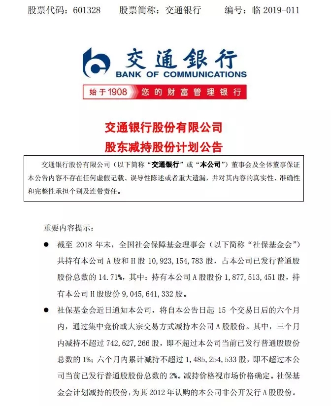 值得注意的是,社保基金会此次减持只是小幅减持,减持后仍至少持有交行12.7%的股份(包括A股、H股),将继续位列交行第三大股东。