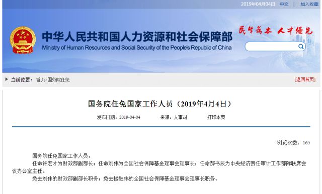 ? 人力资源和社会保障部4月4日发布消息,国务院任命许宏才为财政部副部长;任命刘伟为全国社会保障基金理事会理事长;任命郝书辰为中央经济责任审计工作部际联席会议办公室主任。
