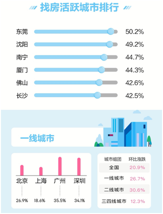 从找房来看,全国用户找房热度环比上涨20.9%,一二线城市找房热度环比明显上升。