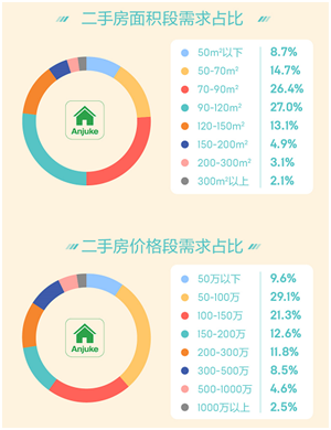 从用户找房需求来看,二手房面积需求70-120㎡面积段房源需求量最大,50㎡以下及200㎡以上面积段房源需求占比较低。价格方面,50-150万价格段房源需求占比超过一半,达到50.4%。