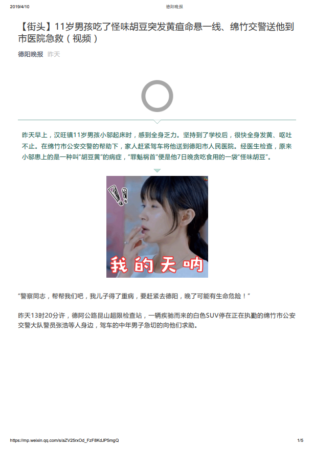 11岁男孩吃了怪味胡豆突发黄疸命悬一线、绵竹交警送他到市医院急救