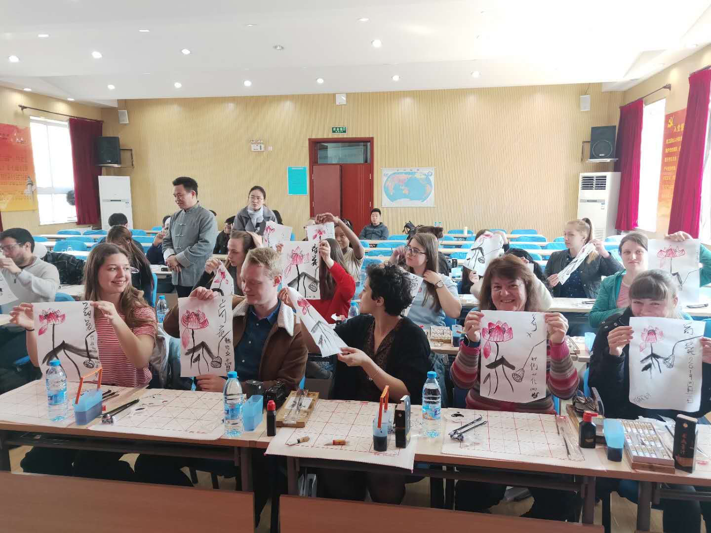 参观中,英国大学生们饶有兴趣地观看了中学生的课间操,并且和孩子们一起做操,举手投足间拉近了中外两国学生的距离。文化交流团学生还在专业老师指导下认真学习了中国传统水墨画技法,荷花片片绽笑脸,春意浓浓乐心间。
