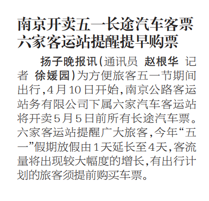 【扬子晚报】南京开卖五一长途汽车客票 六家客运站提醒提早购票