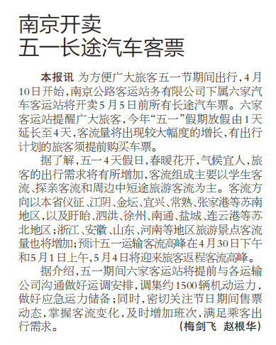 【江苏经济报】南京开卖 五一长途汽车客票
