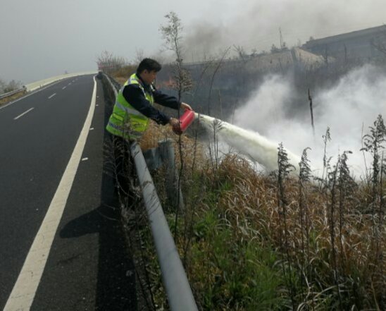 见此情景,队员们立刻停车,从执法车里取出灭火器对准着火点喷洒灭火,扑灭一处直接用脚踩踏零星火源,用手捧泥土覆盖火苗,防止死灰复燃,尽全力试图阻断火势蔓延。同时向路公司请求派人支援,经过联合紧急处置,明火被全部扑灭,由于发现及时,处置得当,未造成任何损失,有效地保护了公路桥梁安全,保障了高速通行安全。