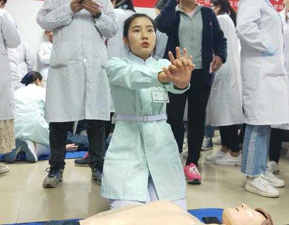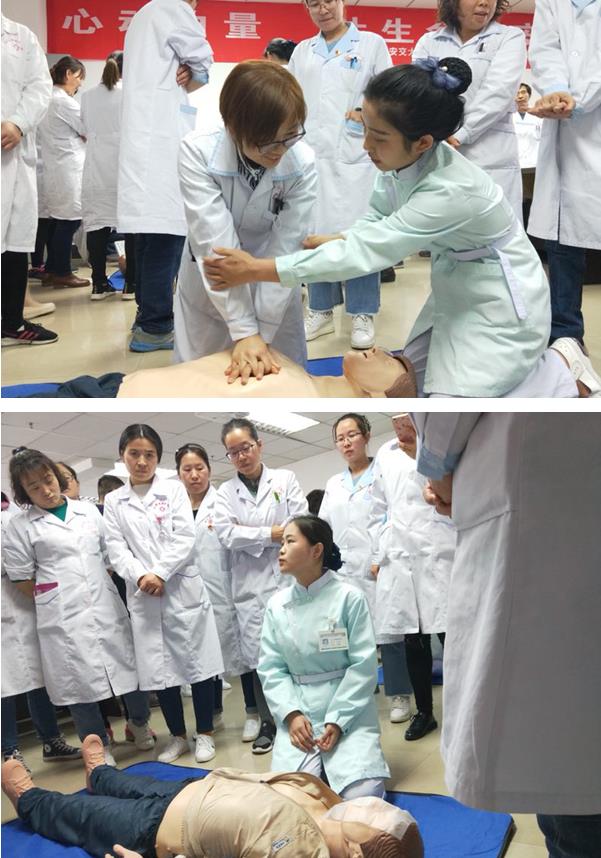 理论培训结束后,操作培训分为2组,由西安交大一附院重症医学科徐翠翠护理师、刘茹护理师操作带教,分别对心肺复苏呼-叫-C-A-B操作的各个步骤进行演示,并耐心指导每一位校医院人员练习,确保每一个急救步骤的正确性。
