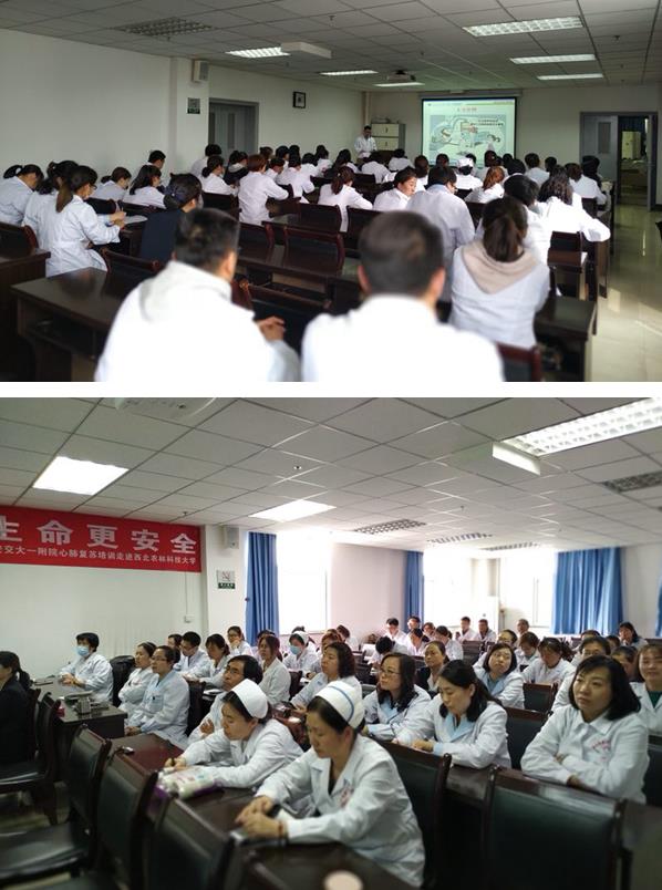 理论由西安交大一附院重症医学科郭利涛副主任医师进行讲解。当遇到患者发生心跳骤停时,如何正确识别,在最短时间里正确有效的提供心肺复苏,做到正确施救呢?郭老师以问题的方式引入培训。理论培训现场气氛热烈,大家都认真记录着郭老师传授的技能点。