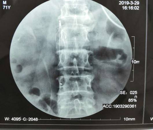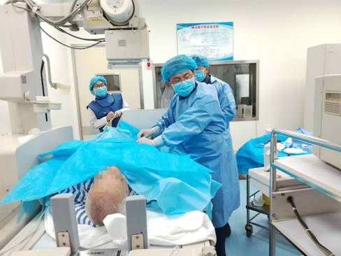 患者王某因骨折合并双下肢深静脉血栓来东院就诊,骨科宋楹卓主任和本部血管外科杨林副教授会诊后,认为患者深静脉血栓复合较重,随时有发生肺栓塞猝死的危险性,必须抓紧手术。汇报血管外科刘建林主任后,决定对患者先行下腔静脉滤网置入术,预防致死性肺栓塞发生,再进行人工股骨头置换。在完善相关检查后,明确患者具有手术适应症,由杨林副教授手术,宋楹卓主任协助,在局麻下行新型可回收下腔静脉滤网置入术,手术顺利。随后在全麻下行左侧人工股骨头置换术,术后第二天患者便能下地站立。