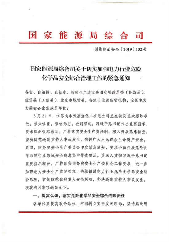 能源局综合司关于切实加强电力行业危险化学品安全综合治理工作的紧急通