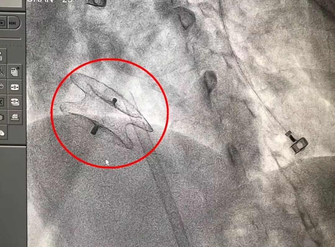 考虑到李阿姨的病情非常紧急,医生决定为李阿姨进行手术。第二天,李阿姨被送进了导管室,医生通过穿刺李阿姨的股静脉,将双盘状封堵器送至左心房。打开左房面,通过特制鞘管,在X线和超声的引导下,将大小合适的封堵器送至病变部位封堵缺损。术中通过透视后前位,两盘片基本呈同心圆状。