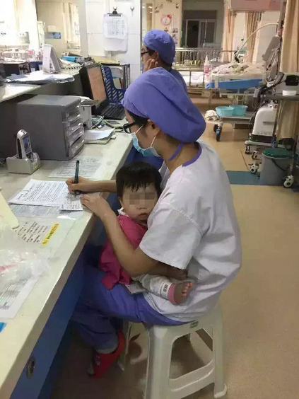 一名来自许昌福利院的小患者婷婷被送到郑州人民医院爱心病房。许是因为到了一个陌生的环境,婷婷哭闹不止,抱一抱哄一哄,哭声渐渐止住,一放下又哭了。不管小婷婷,护士许姝悦不忍心,放下工作更不可能。别无他法,许姝悦只好一边怀抱着小婷婷,一边写着病历。