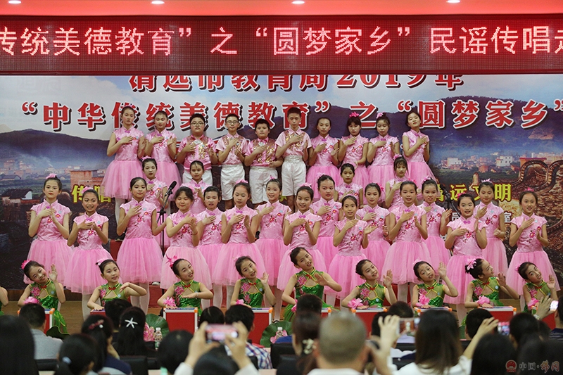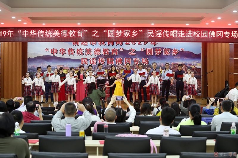 下午,2019年“中华传统美德教育”之“圆梦家乡”民谣传唱进校园佛冈专场在佛冈县第一中学隆重举行。高常立一行、佛冈县县委常委宣传部部长黄丽、县教育局领导、市县创文办专干及全县中小学师生代表300多人参加了活动。高常立为“民谣传唱”活动中作动员讲话。他表示,通过民谣传唱系列专场活动,将会带动更多的清远中小学生传唱清远民谣,唱响“清远民谣”这一清远好声音,必将点燃孩子们的爱国爱乡情感,树立文明风尚,为清远创建全国文明城市加分添彩。黄丽向莅临活动现场的领导嘉宾和参加“民谣传唱”的师生们表示热烈的欢迎,并希望通过本次活动,再次掀起我县中小学生传承和弘扬中华优秀文化的热潮。一首由清远民谣歌手温尚辉演唱自创的民谣《清远》拉开了民谣传唱环节的序幕,来自民谣传唱“小使者”温立研唱出英文版的《清远》和《我自清远来》,此后民谣歌手们继续传唱《奔跑吧清远》、《江心岛》、《飞来湖》等清远原创民谣。在市教育局代表将两把吉他捐赠给佛冈县第一中学的音乐爱好学生后,领导嘉宾上台和学生们一起唱响由高常立作词、温尚辉作曲的清远童谣《我自清远来》,掀起全场活动的高潮。