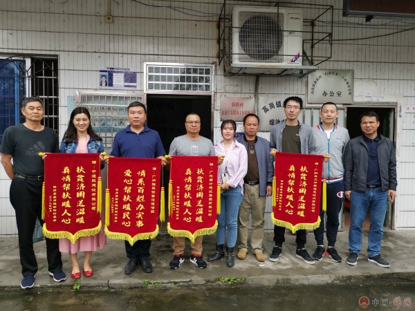 4月14日,高岗镇新联村民委员会将印有“情系百姓办实事,爱心帮扶暖人心”和“扶贫济困送温暖,真情帮扶暖人心”的锦旗分别送到广州陆军预备役某部、广东南方建设集团有限公司、中通服建设有限公司和广州华工中云信息技术有限公司志愿者手里,感谢他们在精准扶贫工作中给予大力的支持和帮助。
