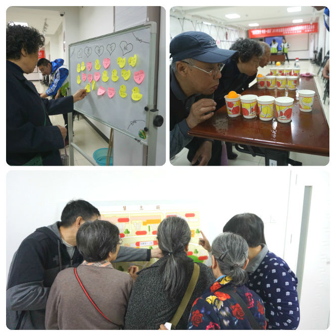 为了增进大家对社区的了解和进一步推进学习强国软件的知识,游园会的第一个项目是学习强加知识竞答。随着社工抛出的一个个问题,大家纷纷绞尽脑汁答题,现场气氛非常活跃。接着是社区地图,考虑到安慧里北是新划分出来的社区,社工为了让大家熟悉社区,特意设立了社区地图的板块,果然引来了大家的注意。看着空白的地图板,居民有的手摸着下巴,辨识思考着自己家的位置,有的和伙伴低声讨论着,“这是2栋,这是6栋”,有的略一思考,直接将地标贴上,方向感差的,也在社工的指导下恍然大悟,找对了家。心愿留言板上也贴满了居民对社区的期望以及祝福。“水上乒乓球”和“夹弹珠”的游戏让整个会议室都充满了欢声笑语。