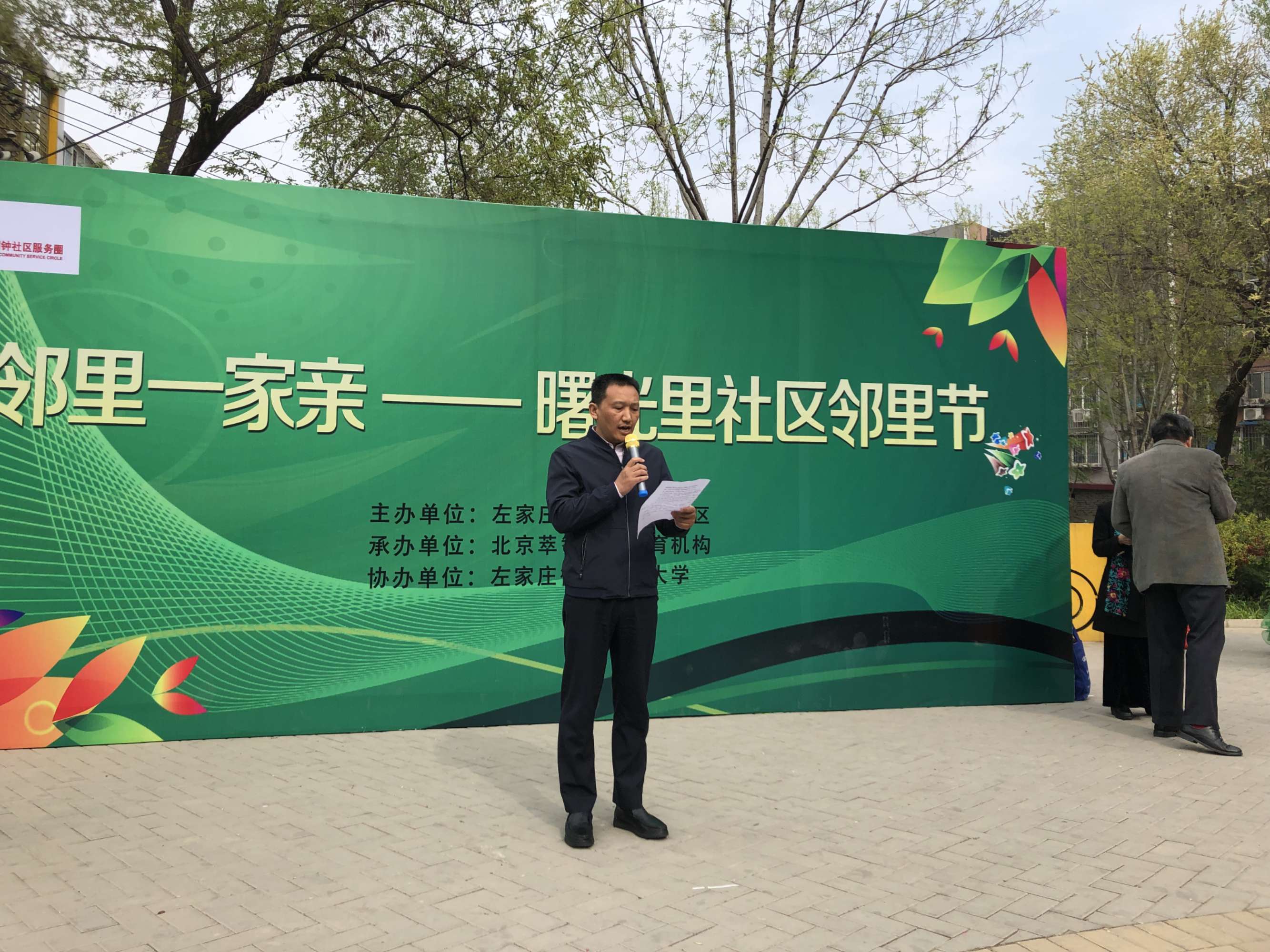 4月13日上午9点,邻里节在市政小广场正式开幕,左家庄街道办事处副主任王勇森、社区党委书记张陶琳致开幕词,随后曙光里辖区“一刻钟服务圈”代表上台发言。