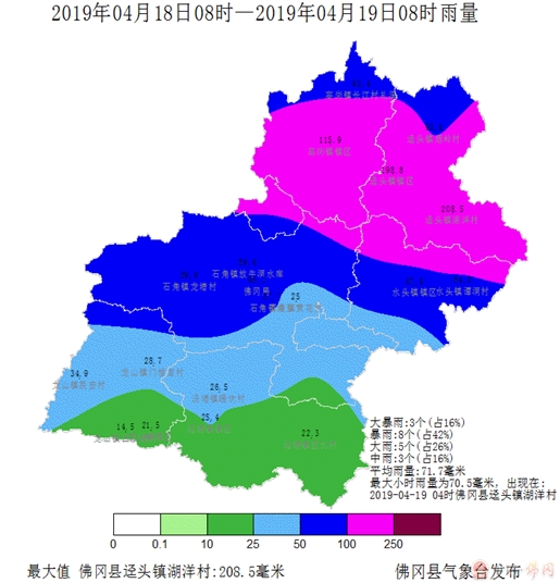 受强盛西南气流影响,我县中北部出现暴雨局部大暴雨。18日08时-19日08时,全县平均雨量71.7毫米,雨量较大站点有(毫米):迳头镇湖洋208.5、迳头镇政府198.8、高岗镇政府115.9。04时迳头镇湖洋录得最大小时雨量70.5毫米。南部出现中到大雨。