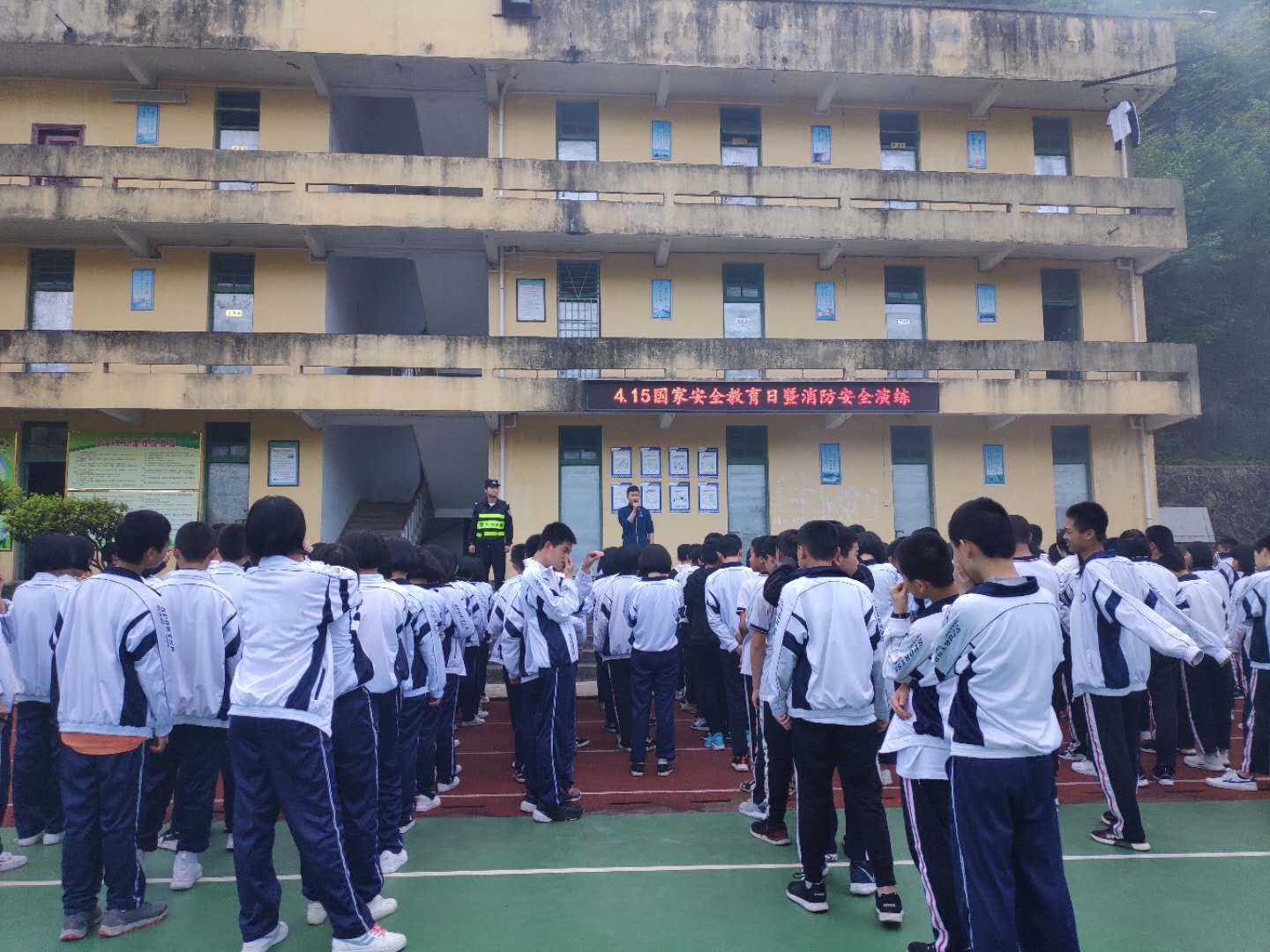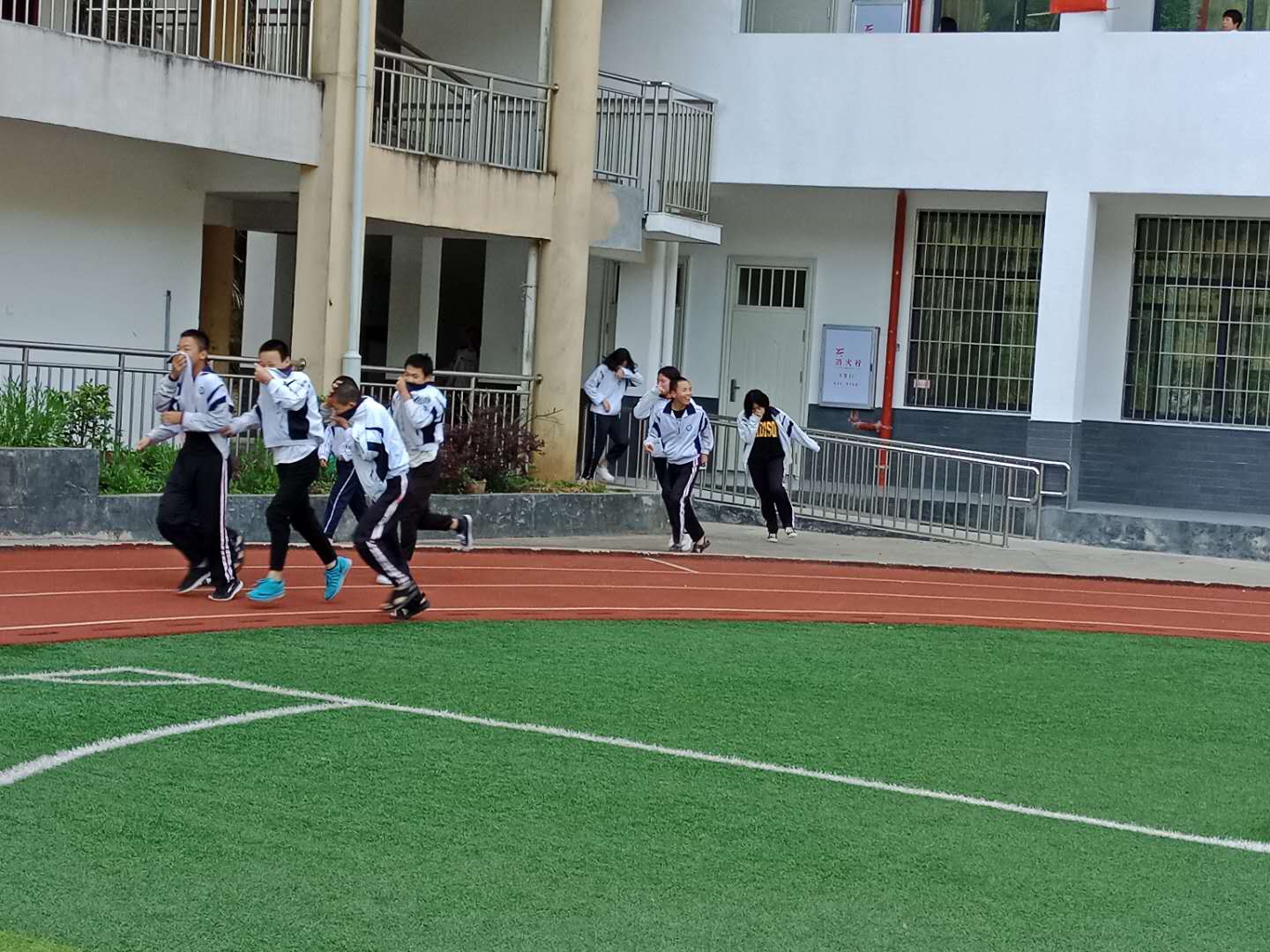 演练过程中,老师组织有序,同学们捂住口鼻,俯身快步离开教学楼,无拥挤、摔倒、踩踏现象发生,在最短的时间内,安全有序地到达操场集合地点,演练活动达到了预期的效果。