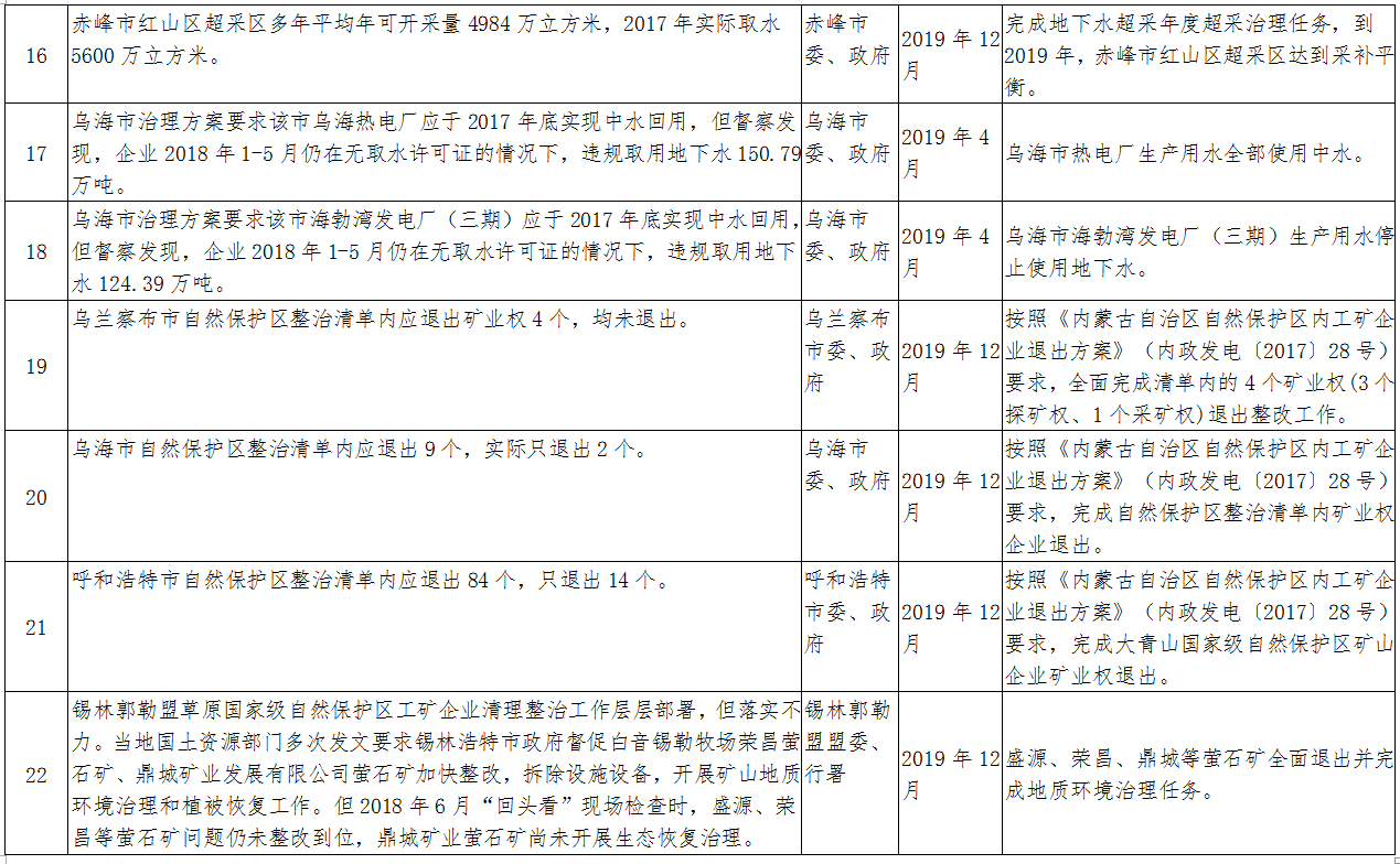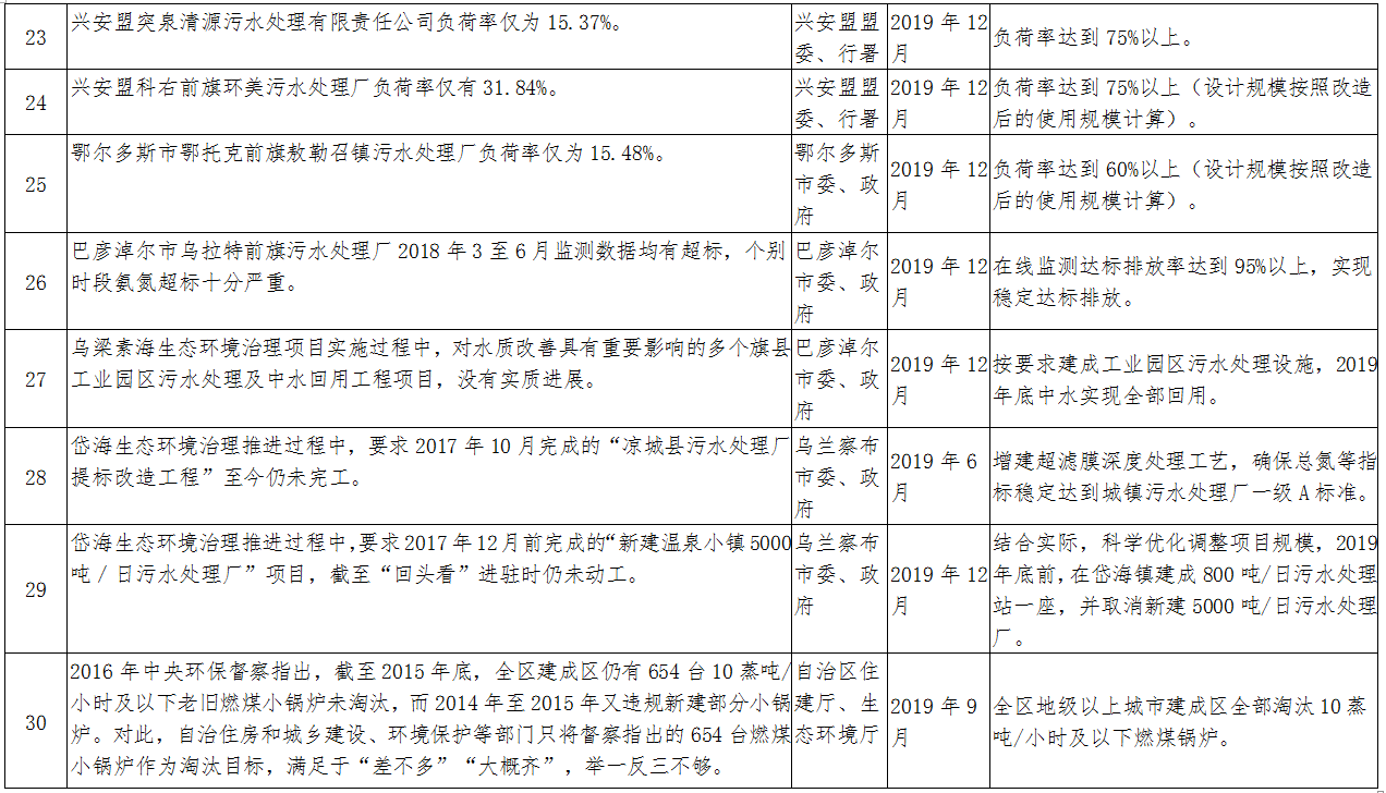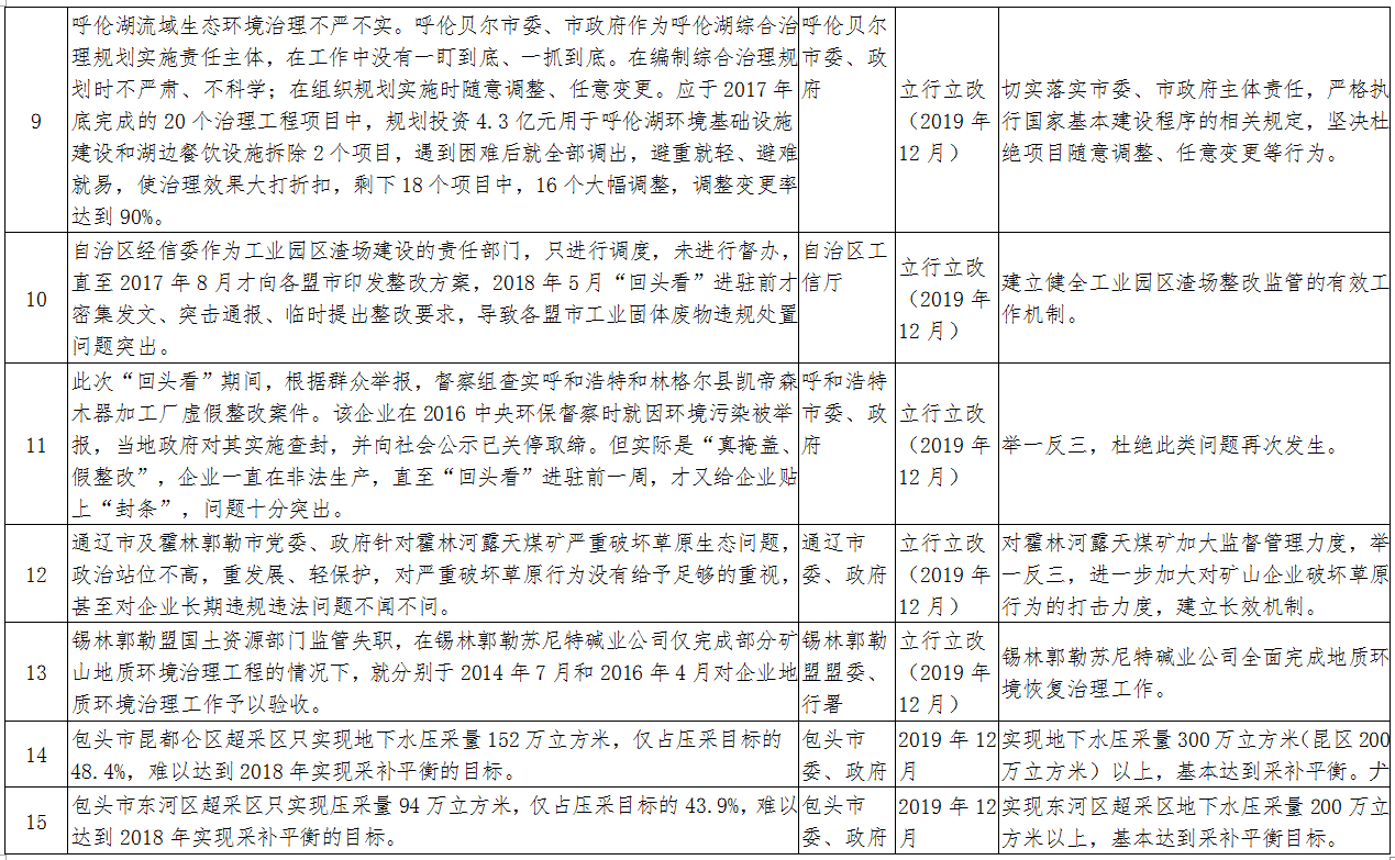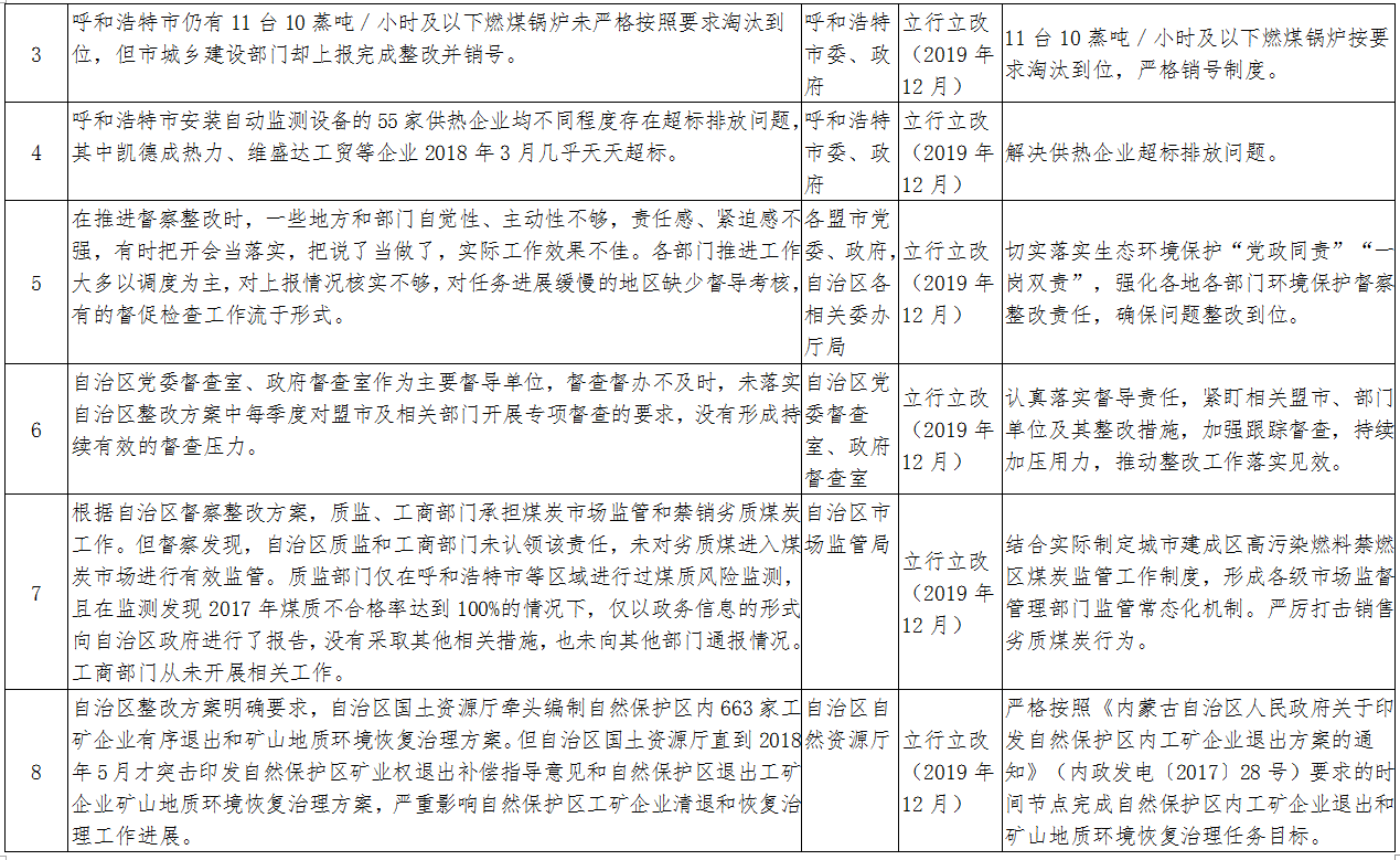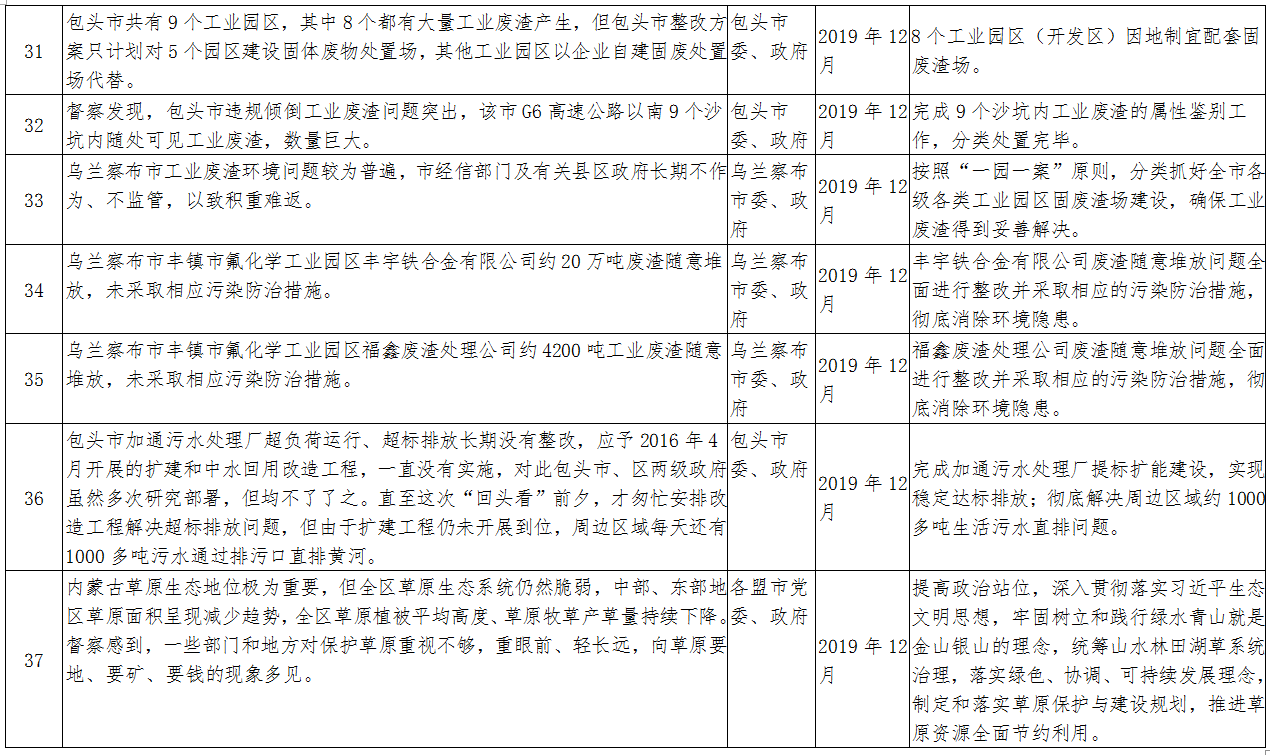 2018年6月6日至7月6日,中央第二环境保护督察组对我区第一轮中央环境保护督察整改情况开展了“回头看”,针对草原生态环境问题统筹进行了专项督察。2018年10月17日,督察组向我区反馈了督察意见。2019年2月27日,自治区印发了《内蒙古自治区贯彻落实中央环境保护督察“回头看”及草原生态环境问题专项督察反馈意见整改方案》(以下简称《整改方案》)。《整改方案》中要求立行立改(在2019年12月底前完成)的有13项,应在2019年限期完成的有26项。现将立行立改和2019年限期完成的整改任务进行公布,请各地各部门高度重视中央环保督察整改工作,进一步树牢“四个意识”,从践行“两个维护”、遵守政治纪律和政治规矩的高度,增强督察整改自觉,以铁的决心、铁的措施、铁的纪律坚决整改、彻底整改,确保所有问题按时序进度完成整改。同时,欢迎社会各界监督各地、各部门整改工作推进情况。