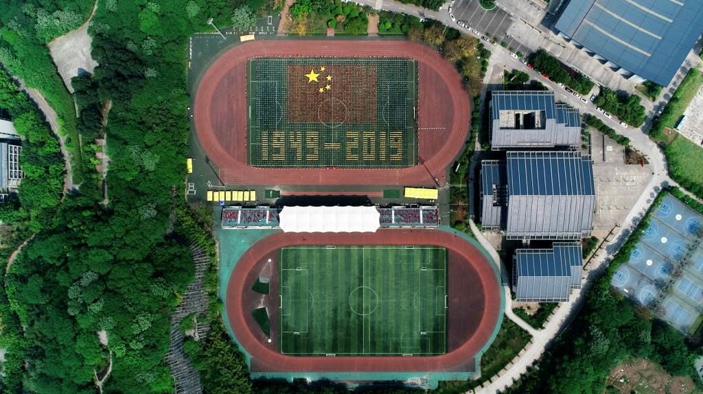 不同于往届运动会的开幕式,各学院运动员以方队形式入场。本次运动会,正值新中国成立七十周年纪念,伴随着响亮激昂的入场曲,身着红、黄、蓝三色服装的花溪校区全体学生,迈着整齐有力的步伐,以最昂扬、最饱满的精神状态进入运动场。在调整好位置后,全体重理学子为祖国献上了自己的祝福,他们用身体构成一面鲜艳的五星红旗,鲜红当中的五颗黄星熠熠生辉,在国旗下方,呈现出“1949-2019”的数字图案,并由全校师生带来“万人大合唱”。一曲《我和我的祖国》,诉诸了重理学子对祖国的美好祝愿;一首《歌唱祖国》,表达了重理学子对祖国的深情关怀。