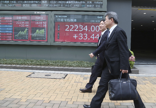 4月22日,行人经过日本东京街头的一处股市信息显示屏。
