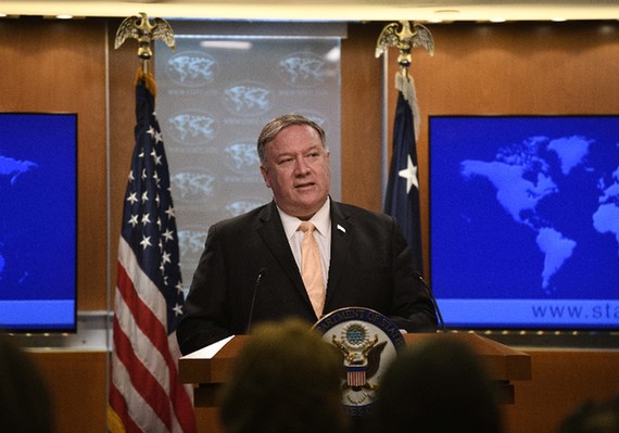 4月22日,在美国华盛顿,美国国务卿蓬佩奥在记者会上讲话。