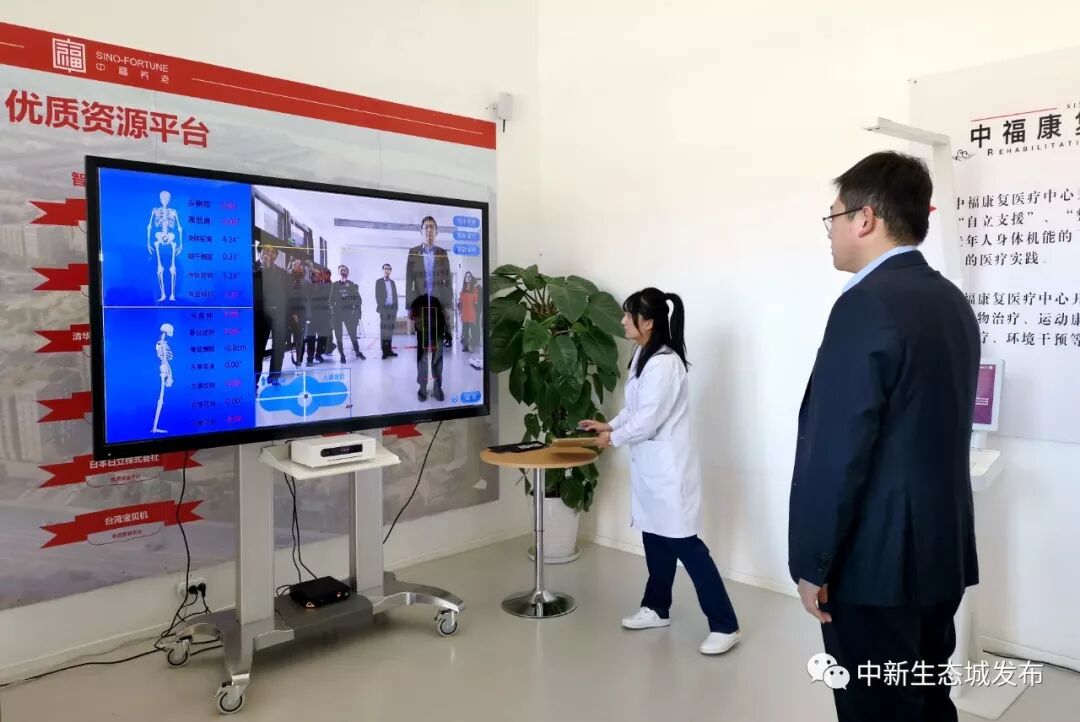 在中福智慧养老服务示范区,类似这样的“前沿合作项目”还有很多。一走进示范区的门口,一台来自日本的红外体感测试仪就能捕捉到来访者的信息,并能根据红外成像及体感技术,对人体静态姿势、步态、平衡等运动功能进行快速评估。只需要几秒钟的时间,通过3D图像生成的人体骨架系统和人工智能分析,就能发现其是否存在高低肩、骨盆倾斜等问题,并据此“对症下药”,开出一张包含饮食、运动等要素在内的“健康处方”。这是中福与日本日立公司合作共建的医养科技服务平台的科技项目之一,从2016年合作至今,一直在免费为生态城内的老人提供场景应用服务,通过对老年人身体机能的动态评估,实现疾病的预防、早发现和早干预,让“智慧”更好地满足老人的退养需求。