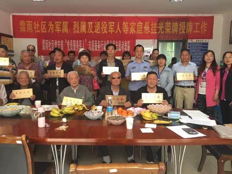 自4月11日以来,霖雨社区党支部开展为退伍军人家庭悬挂“光荣之家”牌匾工作,在月牙塘派出所、物业等支持下,组成了以“党员服务军人”为特色的志愿服务小队,截止目前已经为辖区392家庭完成“光荣之家”挂牌工作。