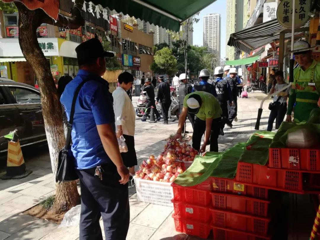 4月24日下午,红云街道办事处结合网格巡查上报的实际情况,启动“党建引领、街道吹哨、部门报到”机制,由街道三级网格长牵头,吹响“重点哨”,对该小区商铺进行整治。交警六大队、区市场监管局、昆明市生态环境局五华分局、区城市管理局、区环卫处、红云派出所、城管红云中队7个部门50余名工作人员到现场报到,共同开展执法检查整顿。通过规范“门前三包”、漫摊经营、查处机动车辆乱停乱放、查验商铺证照、检查餐馆不合格排放等乱象,重点对27家商铺进行检查。对无证经营、无证设置广告牌的商家进行处理,并根据实际情况有针对性的下发整改通知,要求限时整改。