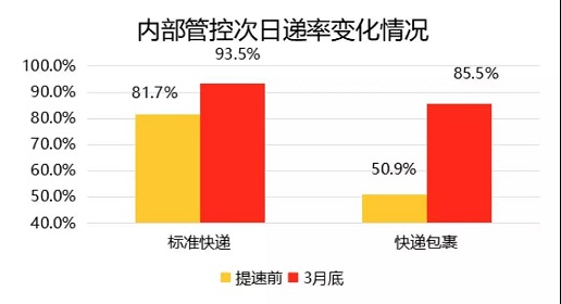 截至2019年3月底,长三角区域内互寄快递包裹内部管控次日递率达85.5%,比提速前提升34.6个百分点;区域内互寄标准快递内部管控次日递率达93.5%,比提速前提升11.8个百分点。