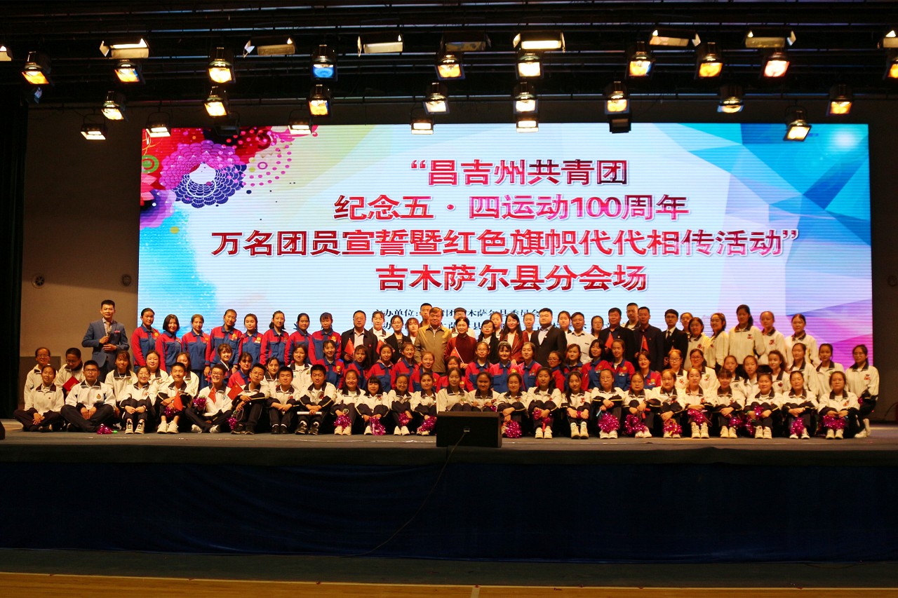 为纪念揭开新民主主义革命序幕的“五·四”爱国运动,在“五·四”运动100周年来临之际,吉木萨尔县团委联合吉木萨尔县教育局、吉木萨尔县文旅局、吉木萨尔县公安局、吉木萨尔县广播电视台在县文体中心共同举办“昌吉州共青团纪念五四运动100周年,万名团员宣誓暨‘红色旗帜代代相传’活动”。本次活动分三个阶段:一、纪念“五·四”,二、入团仪式,三、节目汇演。